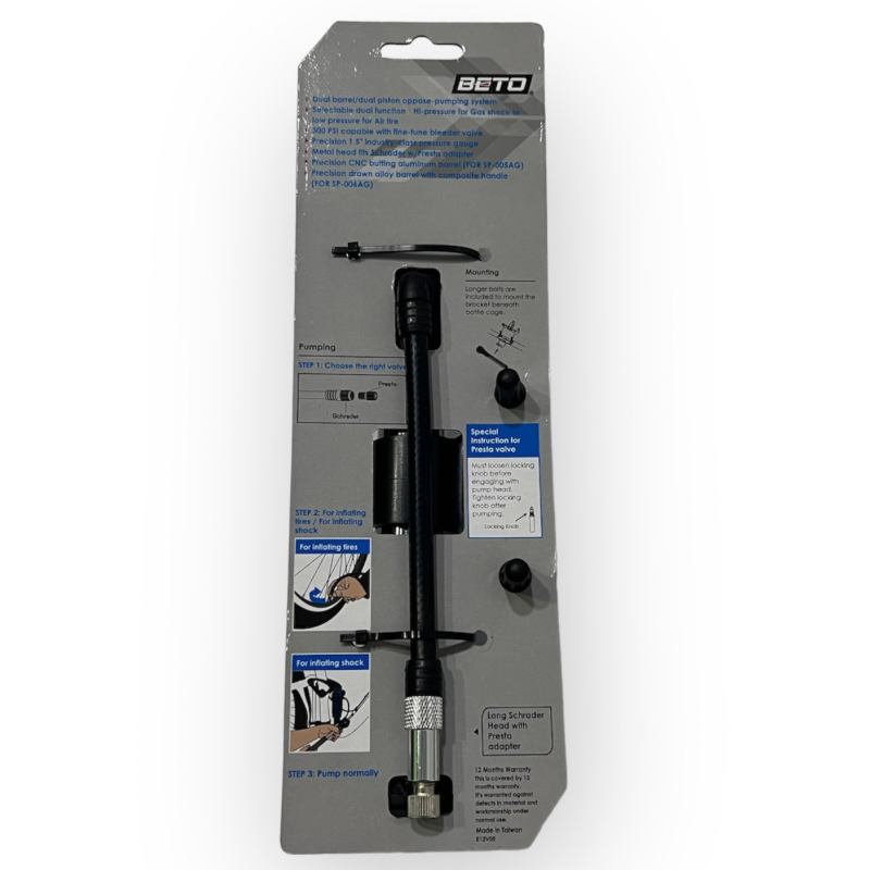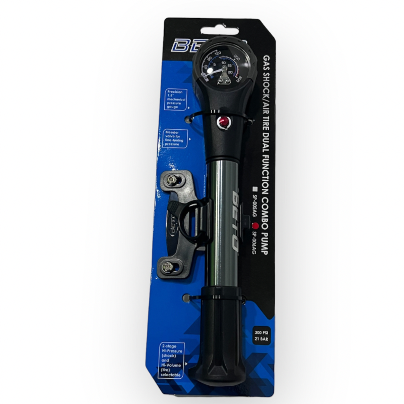 Doble Función para Suspensiones - Shocks y Ruedas Para Válvulas Presta / Schrader Botón Descompresor y Manómetro incluido Opción mayor presión (HP) o mayor volumen (HV) Máx. presión 300 PSI Largo 24cm Peso 208gr